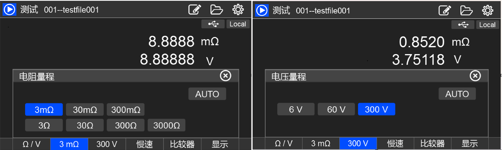 电阻量程 | 3mΩ | 30mΩ | 300mΩ | 3Ω | 30Ω | 300Ω | 3000Ω | |||