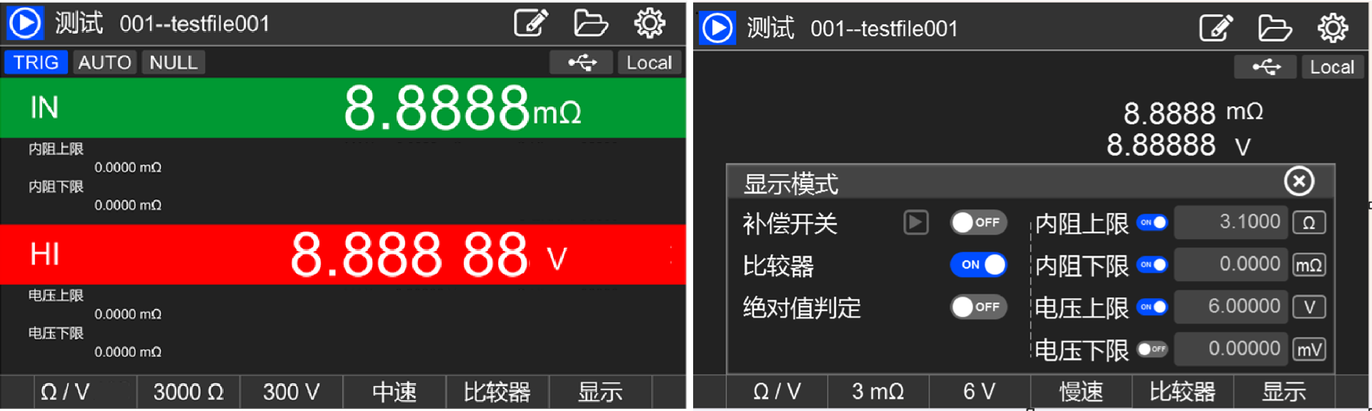 电池内阻和开路电压具有比较器功能开关,可分别设置电阻和电压的上下限值,补偿测试。