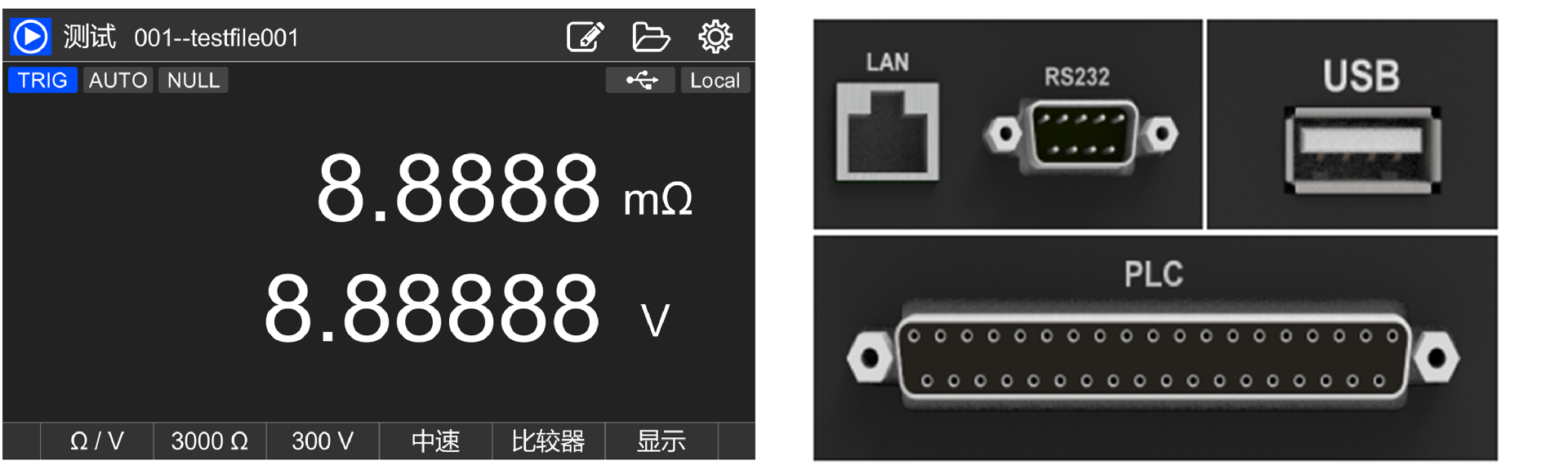 面板功能 | 触屏操作、测试条件存储100组,具备开路侦测、比较器、速度选择、档位选择、功能选择等功能 | |||||||||