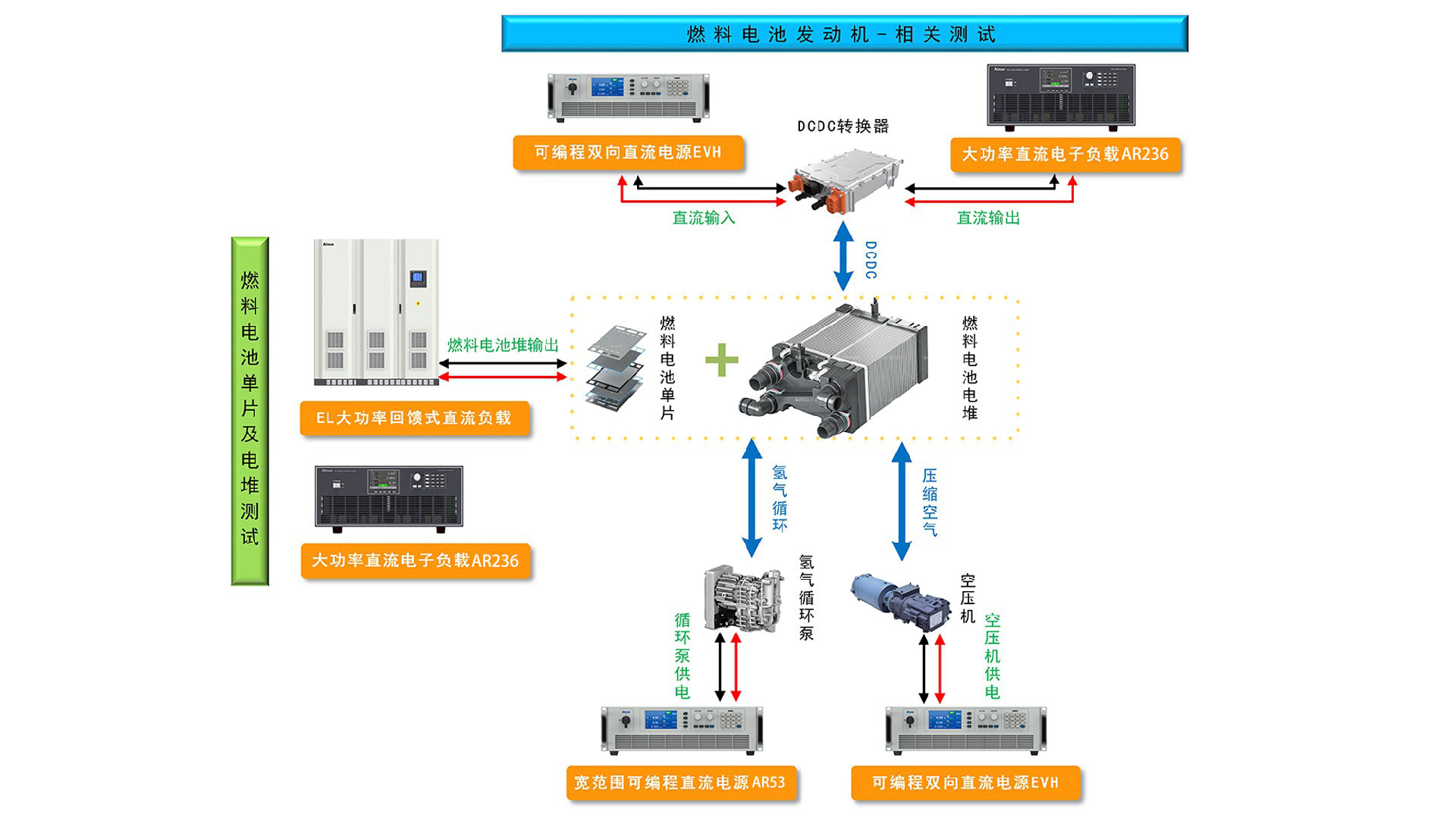 大功率回馈式直流电子负载ANEL系列功率1000KW、电流2000A,具备高性能全功率段能量回馈电网功能。高控制精度、响应速度快,优化的双向DCDC变换技术,直流输入电压范围更宽,可实现0V-满量程的全范围输入。主要应用于燃料电池单片及电堆的电压、电流等测试。可编程双向直流电源AREVH系列为燃料电池空压机测试提供高稳定性的电压电流输出,输出电压范围0-2250V,单机功率30KW,满足燃料电池空压机高功率输出需求。主要验证燃料电池空压机的响应时间、功率调节能力以及过载能力。宽范围可编程直流电源AR53系列电压0-2250V,单机提供15KW输出功率,功率因数高、动态响应快、输出纹波低、功率密度高等优点。具有定功率宽范围输出的突出性能,为氢气循环泵测试提供稳定的电压电流输出。