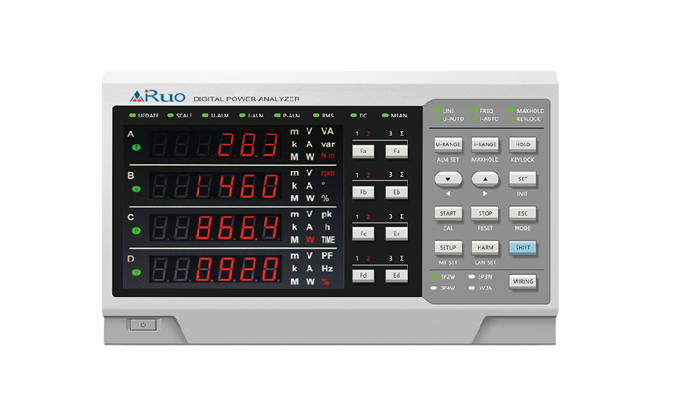 测量参数 | 电压U、电流I、有功功率P、无功功率Q、视在功率S、功率因数λ、电压频率fU、电流频率fI、相位角Φ、效率η、总电能量Wh、正向电能量Wh+、反向电能量Wh-、电流积分Ah、50次谐波分析HDF、电压和电流失真度THD、峰值电压Vpk、峰值电流Ipk、电压峰值因数CfU、电流峰值因数CfI…… | |