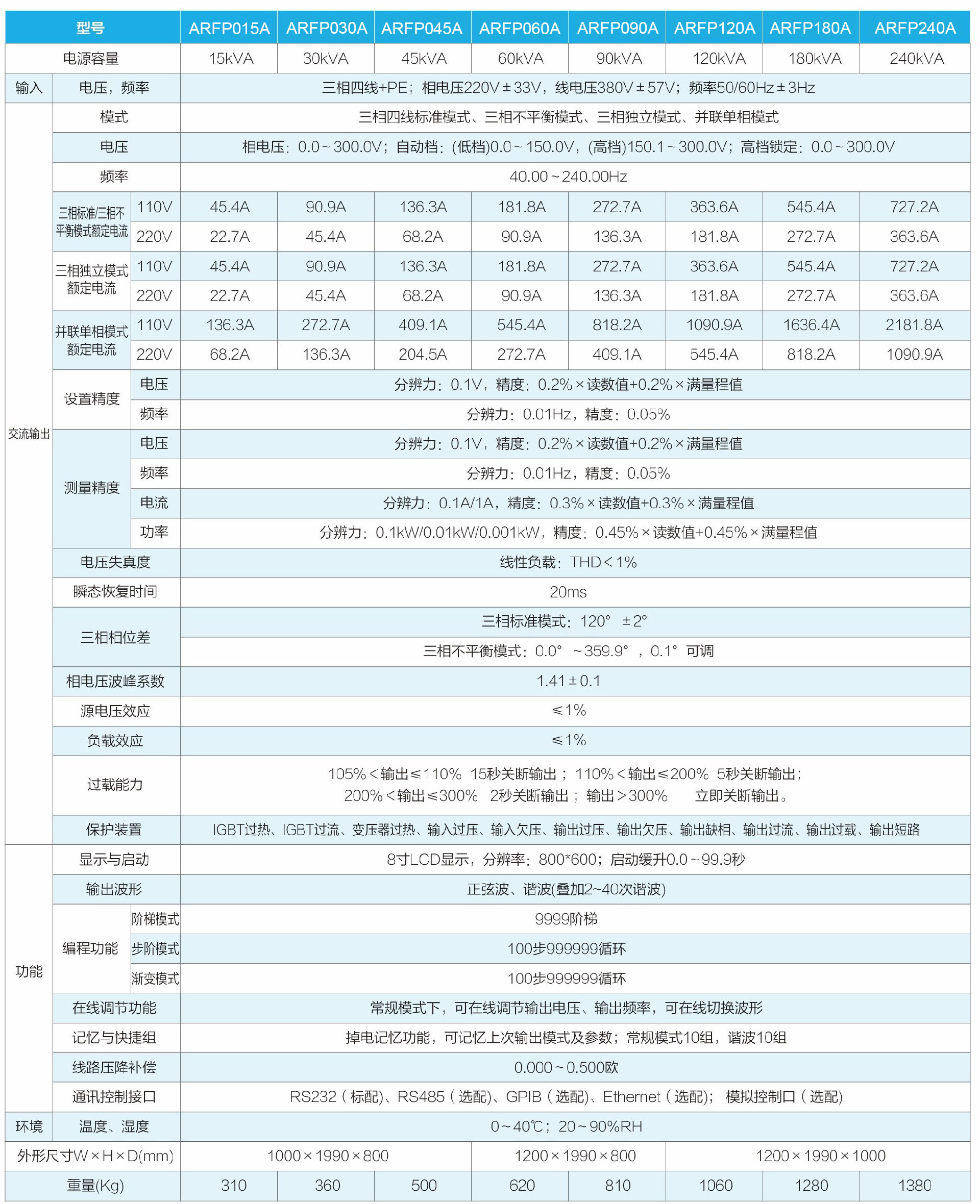 ANFP系列可编程交流电源供应器,采用FPGA数字化控制、瞬时波形控制及高频脉宽调制 (SPWM)等技术,具有响应速度快、输出精度高、波形质量优越等优点。具备可承受3倍额定电流冲击的能力,负载适应性强。具备多种输出模式和复杂可编程功能,可实现阶梯、步阶、渐变等测试要求;具备三相不平衡输出模式,实现相关法规测试或模拟特殊电网供电等要求。可广泛应用于实验室、质检单位、科研院所及认证中心等场所。