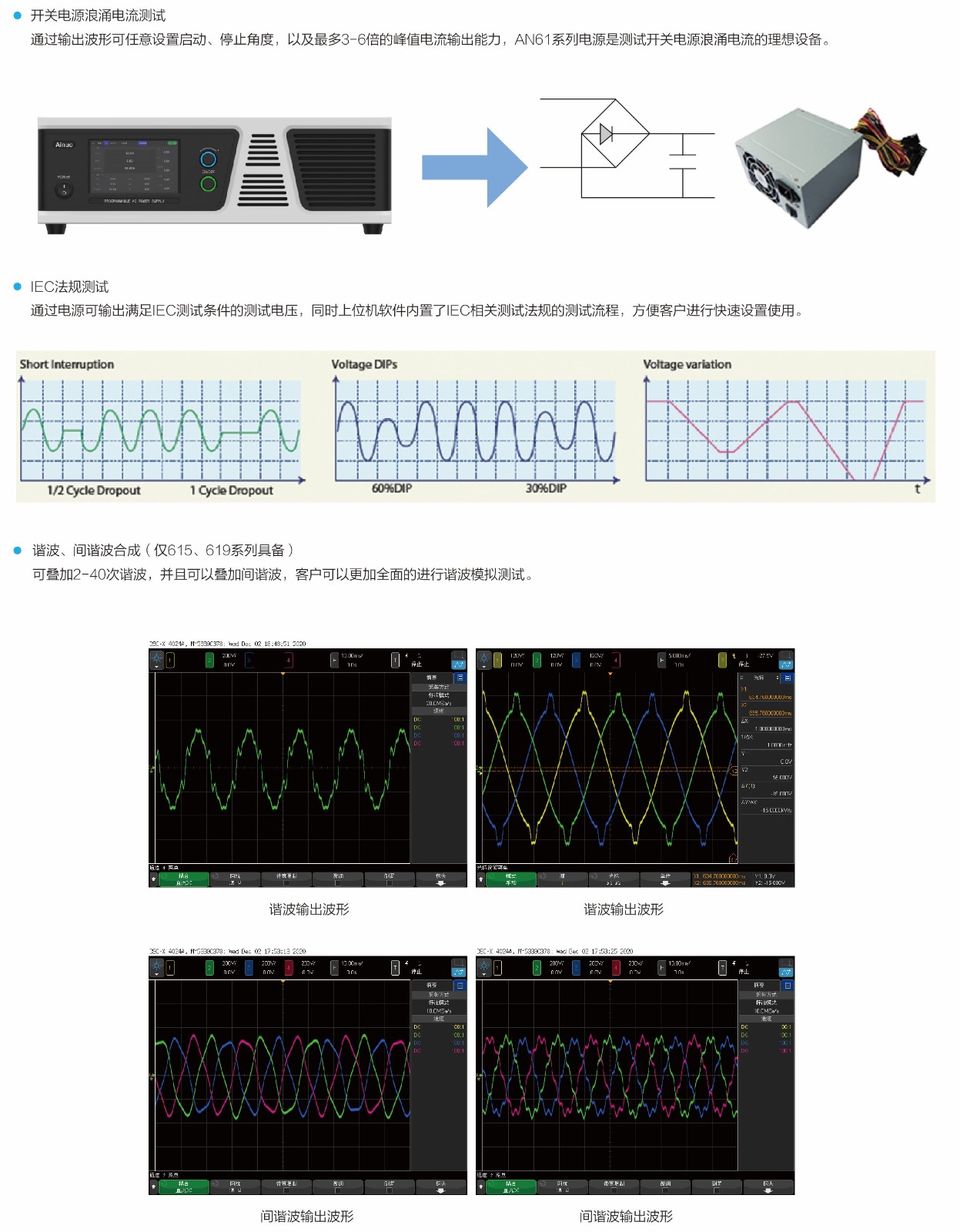 AN61系列交流测试电源,具备可编程功能,能够完成IEC61000-4-11(认证前测试)/-4-13/-4-14/-4-28的法规免疫性测试,另外可程式化的输出阻抗,配合功率分析仪,可实现IEC 61000-3-2 / -3-3 谐波电流限制和闪烁的法规测试是IEC法规测试的设备。