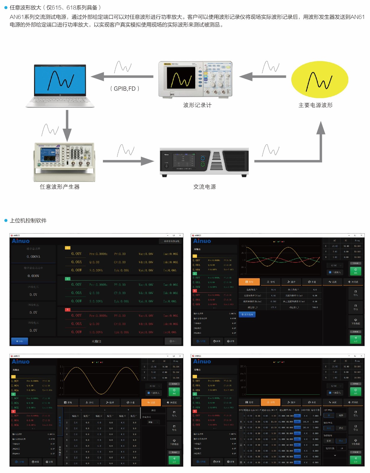 AN61系列可编程交流测试电源,采用SPWM技术、DSP数字处理技术和大功率开关电源技术,可输出交流、直流、交流+直流电源,为交流负载、直流负载和整流型负载等,提供精密的电源输入。具备提供6倍峰值电流的能力,是测量浪涌电流的测试仪器,并且能够设置波形开关机角度,供测试浪涌电流及输出维持时间,还可设定电压及频率的变动率,用来扫描待测物电源输入规格范围。电源可以模拟市电异常瞬升、瞬降、短路、抖动等现象,通过谐波或间谐波叠加功能,模拟市电波形失真,还能够提供精确且快速的电力参数及谐波的测量。AN61系列交流测试电源,电源输出品质专业,广泛应用于电力电子、军工、航空电子、IEC标准测试等行业实验室和生产线。