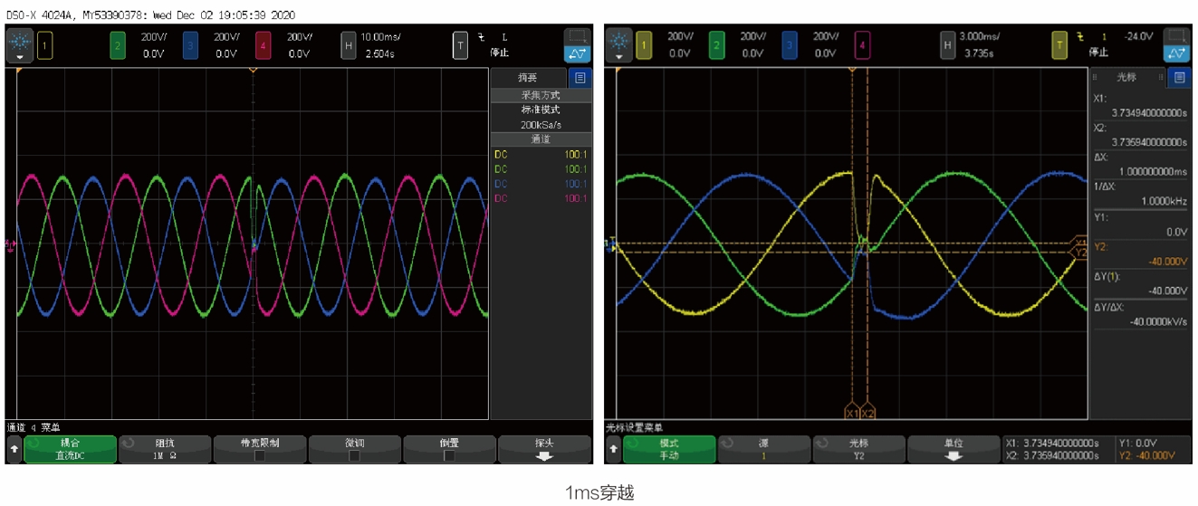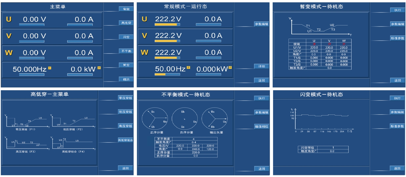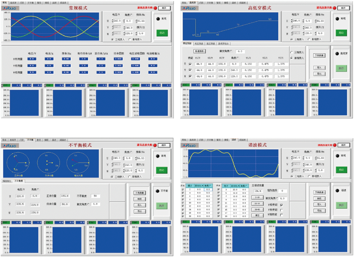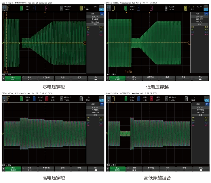 ■ 高低穿:针对光伏行业设置的编程输出方式,用来模拟电网跌落及恢复的过程,可模拟零电压穿越、低电压穿越、高电压穿越、高低穿越组合等多种模式,并可以对电压、维持时间、穿越角度、恢复电压等进行任意设置。
