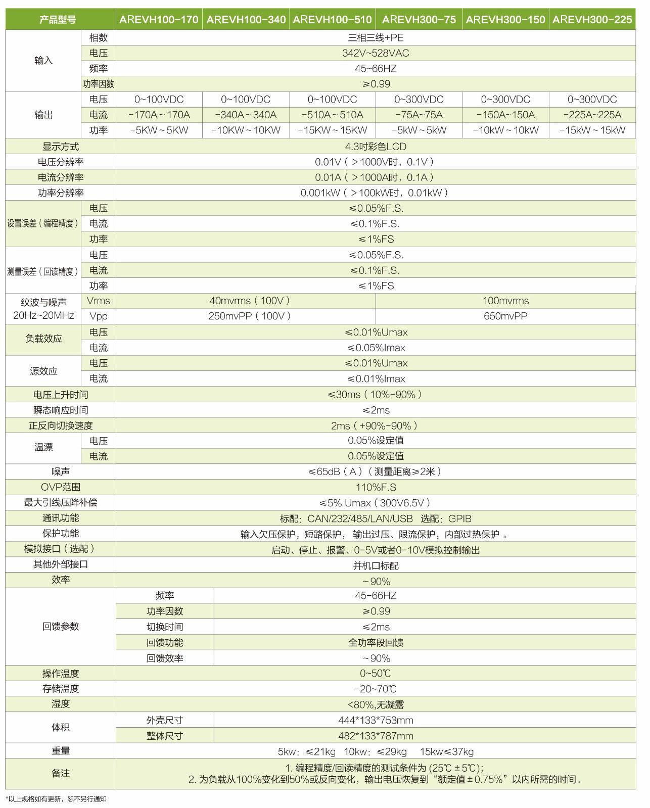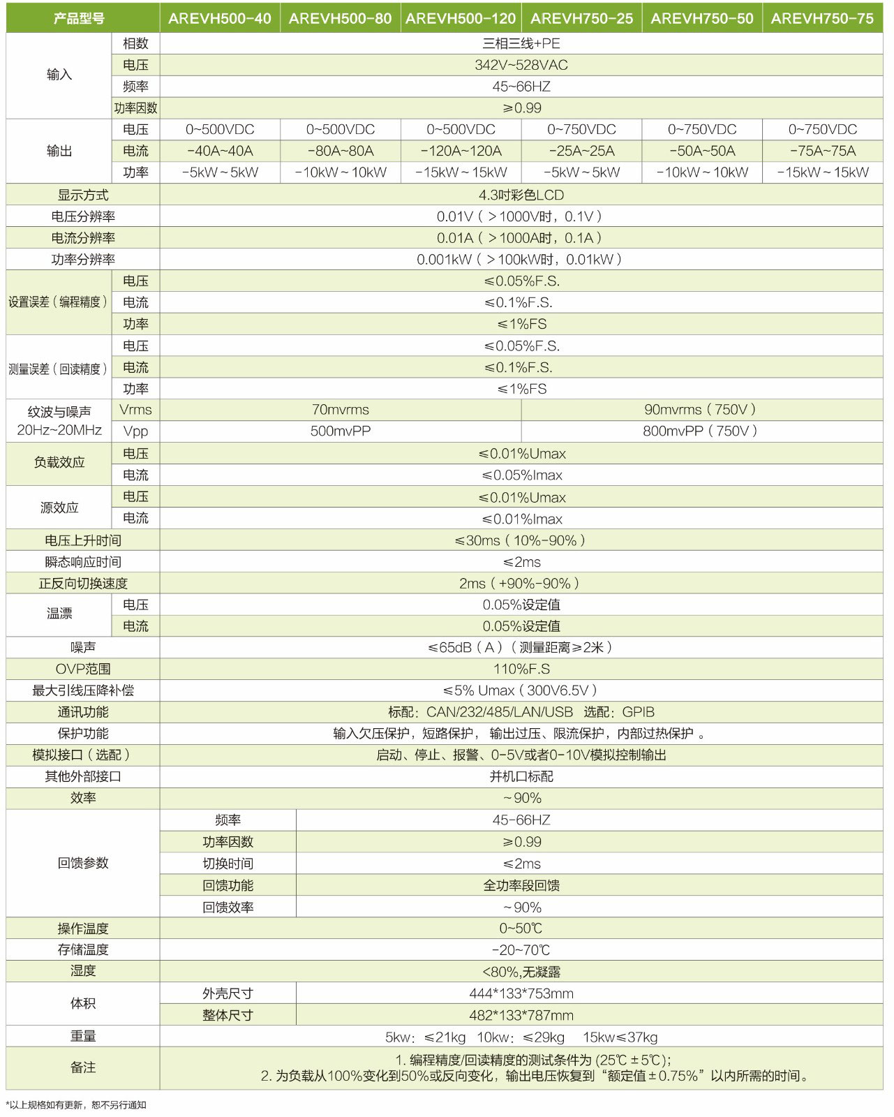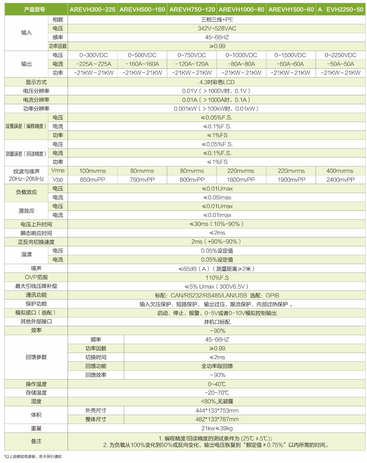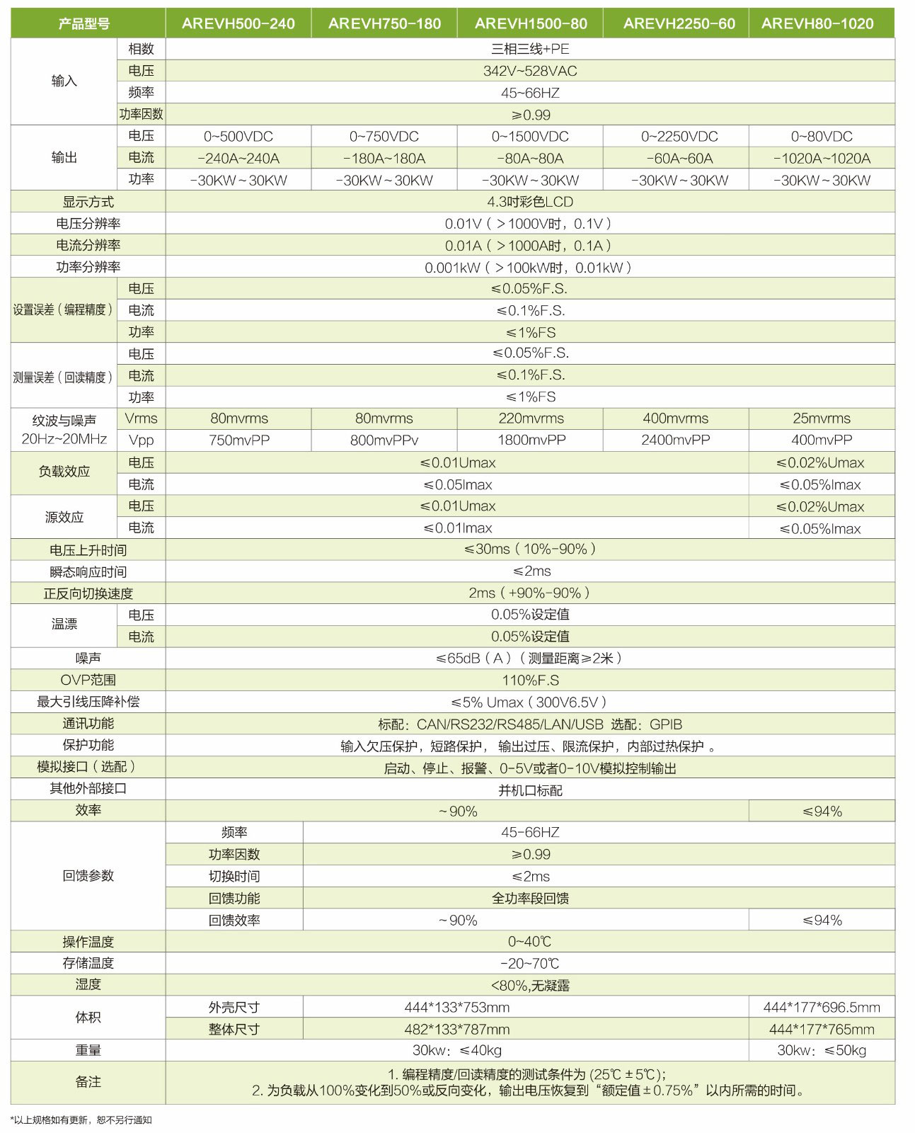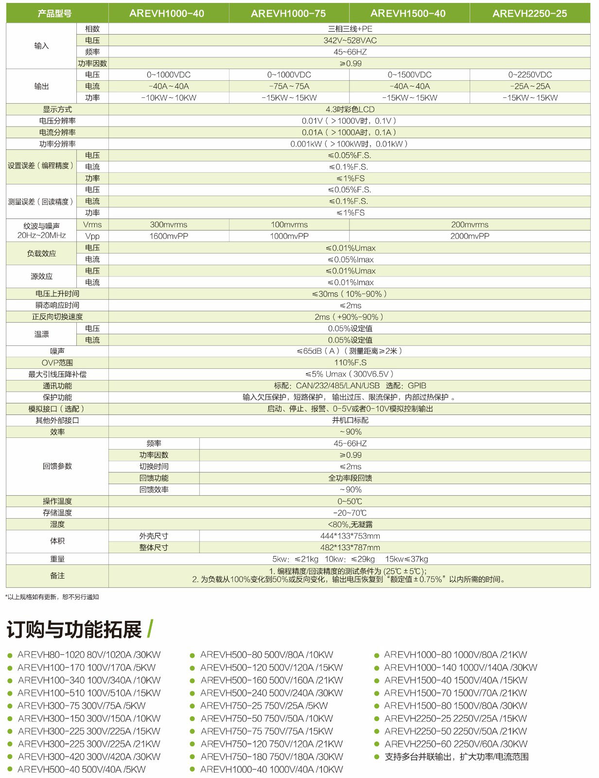 AREVH系列双向可编程直流测试电源全系列7个电压等级,电压等级分布覆盖0V-2250V,支持多台并机,功率可扩展至1M W。能量双向流动,自动无缝切换,高功率密度,快速动态响应特性,内置函数发生器和标准测试曲线,可以自由产生多种波形,优异的特性和丰富的测试功能。适用于实验室、汽车电子、新能源三电、微电网、大功率测试等多种测试场合。