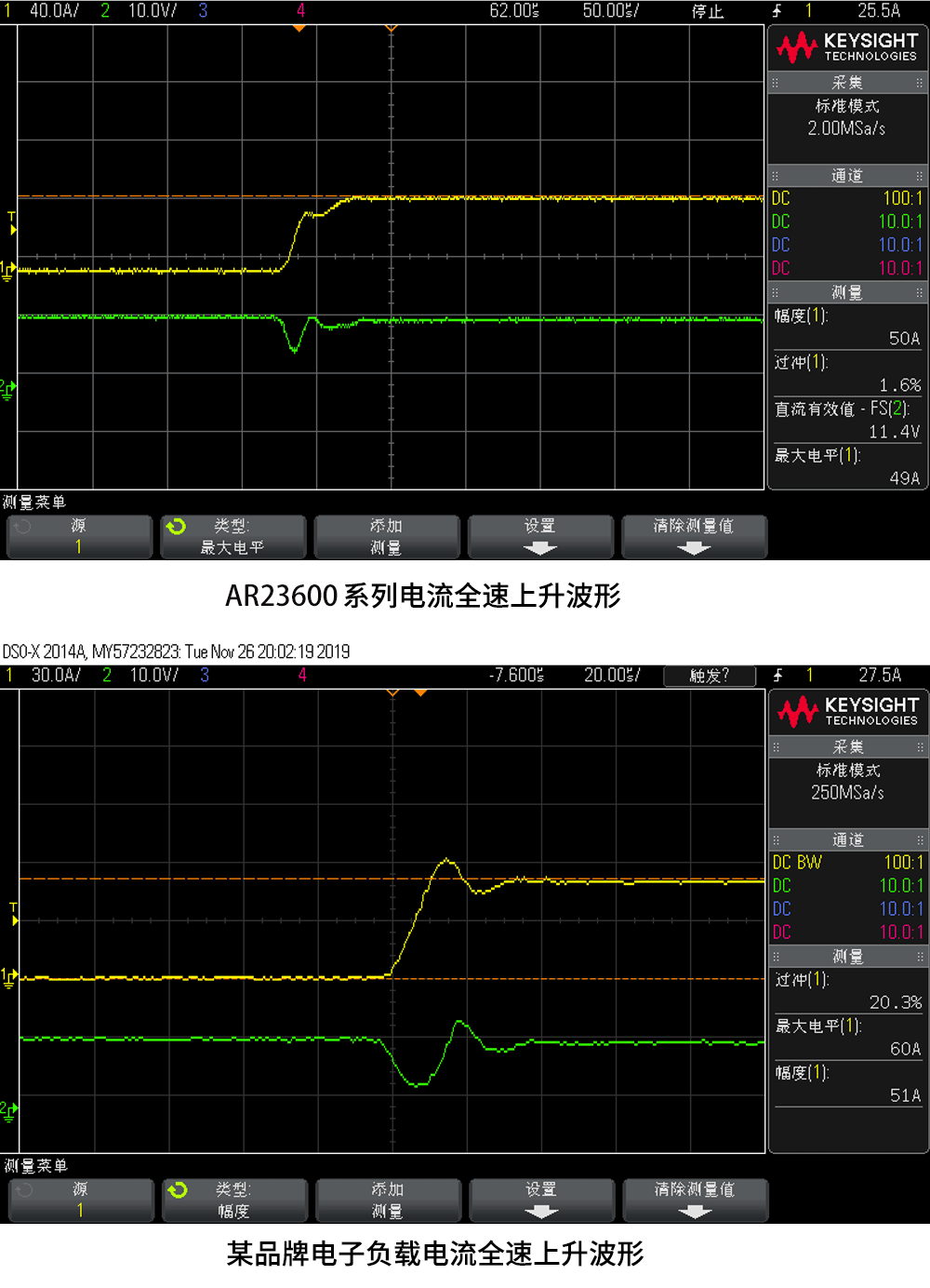■ AN23600E系列负载可以提供超快速的拉载速度。如AN23606E-1200-240可提供12A/uS的上升速度。在解决快速拉载问题的同时,负载内置数字控制器能够保障过冲幅度的最低化。右图为AN23600E负载在全速拉载过程中,电流上升波形与某品牌电子负载的对比。