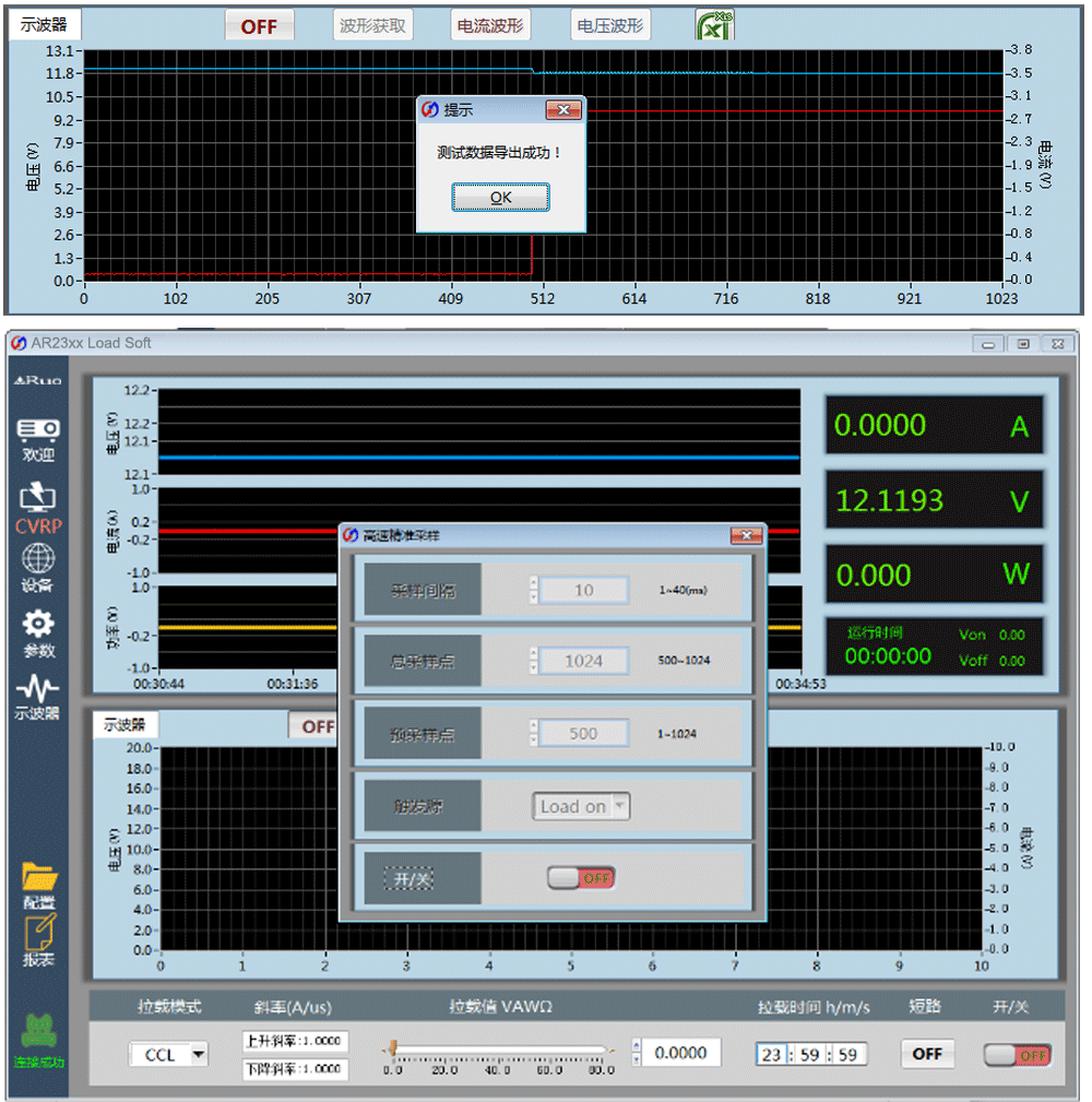 ■ 用户可以使用负载的数据采集功能配合触发源启动抓取瞬间电压,电流的数据,使用上位机软件将数据点绘制成波形呈现出来,测试数据可以导出excel。